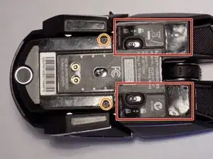 Переверните мышь и снимите наклейки на задней части устройства. Эти наклейки скрывают винты, которые нам нужно удалить.
