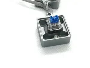 Используя крышку-открывалку для переключателей типа Kailh (с двумя широкими зубцами вместо четырёх), разместите переключатель сверху так, чтобы две пластиковые защёлки по бокам переключателя оказались над двумя зубцами снизу.