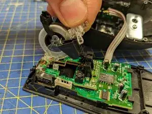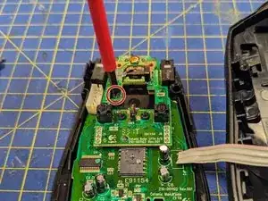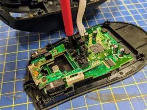 Удалите последний винт, фиксирующий плату (рядом с отверстием, оставшимся от колёсика прокрутки).