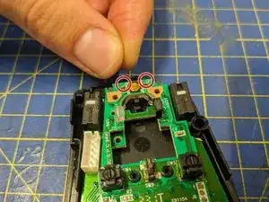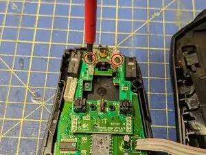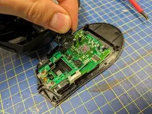 Снимите два винта, которые фиксируют пластиковое крепление колёсика в центре платы.
