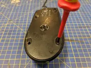 Ослабьте два винта, удерживающие металлическую деталь в передней части мыши.