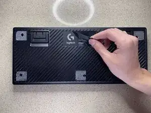 Снимите наклейку Logitech и все резиновые ножки, медленно отклеивая их. Это откроет доступ к отверстиям для винтов.