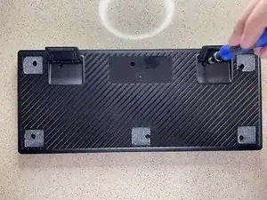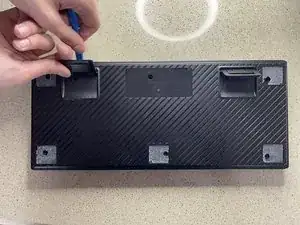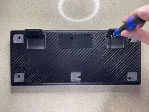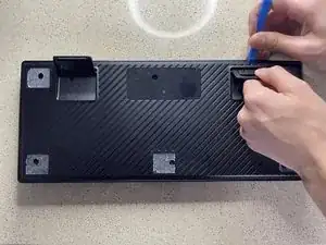 Возьмите инструмент для открывания или приподнимания и нажмите в шов между верхней и нижней панелями, затем осторожно потяните за ножки клавиатуры, чтобы разъединить корпус.