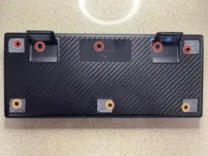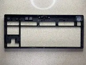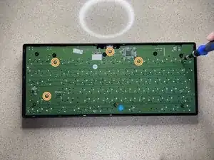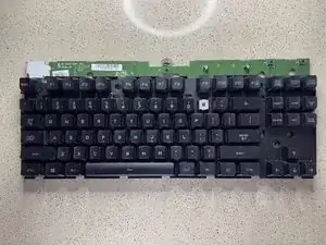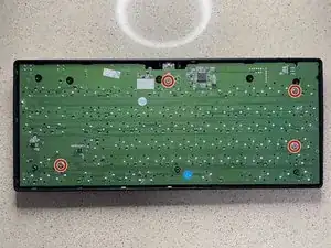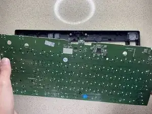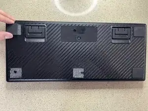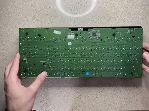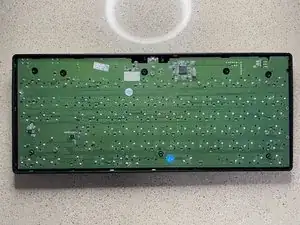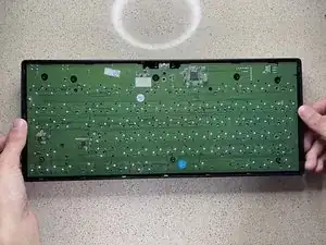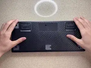 Положите переднюю часть корпуса клавиатуры на стол лицевой стороной вниз. Возьмите плату с прикреплёнными клавишами и совместите её, поместив обратно в переднюю часть корпуса.