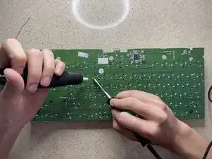 Найдя новый переключатель на обратной стороне платы, приложите паяльник к контакту и аккуратно подайте припой к месту контакта, чтобы создать паяное соединение. Повторите для обеих ножек.