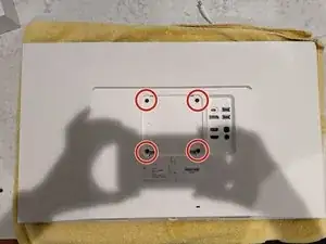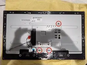 Положите мягкую ткань, например, полотенце на чистую, ровную поверхность. Снимите монитор с крепления и положите его на ткань экраном вниз. Открутите четыре винта, расположенные в области крепления.