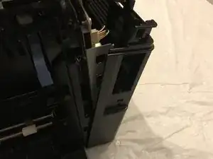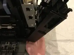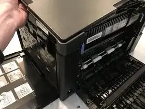 Поднимите принтер снизу, чтобы освободить нижние защёлки, после чего боковая панель отпадёт от принтера.