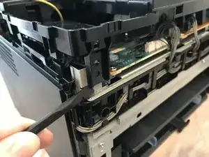 Вставьте монтажный инструмент за каждый конец пластиковой планки. Подденьте наружу, чтобы отщёлкнуть и потянуть концы вперёд от принтера.