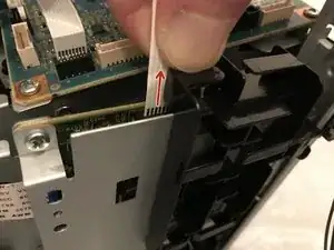 Отцепите фиксирующую защёлку в нижней правой части кронштейна вентилятора, чтобы ослабить его от принтера.