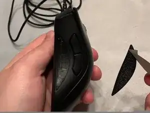 Поверните мышь на 90 градусов против часовой стрелки и снимите старые накладки мыши.
