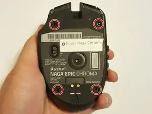 С помощью лопатки удалите тефлоновую ленту на нижней части мыши, чтобы открыть четыре винта.