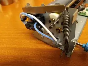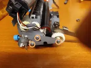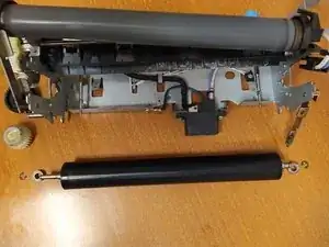 Этот клин поднимает рычаг, уменьшая давление на ролики, которое в противном случае создаёт плоские участки на мягком прижимном ролике. Принтер перемещает этот клин, чтобы увеличить давление только тогда, когда ролики вращаются и готовы к печати.