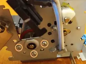 Снимите блок из трёх шестерёнок, чтобы получить доступ к чёрному приводному шкиву.