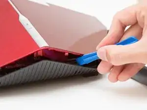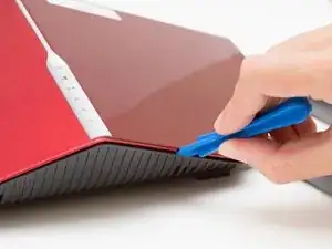 Вставьте инструмент для вскрытия между красной верхней панелей и серой нижней панелей.