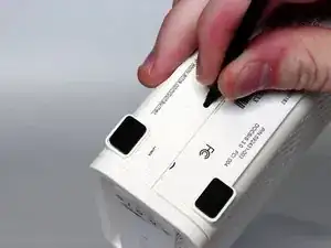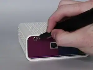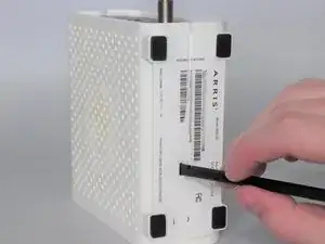 Используйте лопатку, чтобы нажать пластмассовый фиксатор внутрь и в направлении к центру модема.