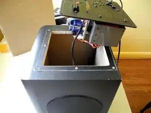 Когда все 8 винтов усилителя будут сняты, МЕДЛЕННО поднимите сборку усилителя из корпуса сабвуфера. Будьте осторожны. Красные и чёрные провода динамиков в чёрной изоляции, соединяющие усилитель с динамиком, немного натянуты. Не тяните за провода динамиков — вы можете повредить что‑то.