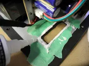 Наклейте малярную ленту на металлическую стенку усилителя вокруг четырёх сторон отверстия для разъёмов. Я наклеил ленту примерно на 2–3 мм от каждой стороны отверстия, чтобы герметик выступал на 2–3 мм от края.