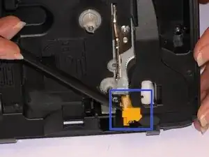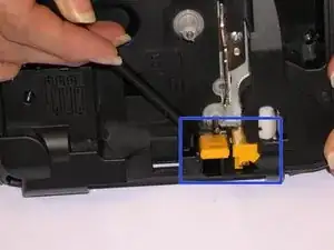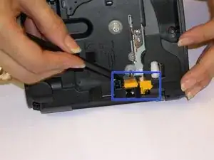 После того как устройство раскрыто, найдите лезвие, которое в этом конкретном принтере этикеток окрашено в жёлтый цвет, как указано в руководстве.