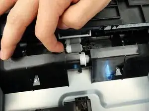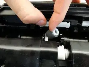 Большим пальцем вдавите белый пластиковый язычок, нависающий над роликом, и указательным пальцем подденьте ролик, чтобы вынуть его.