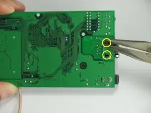 С помощью тонкогубцев сожмите два чёрных пластиковых защёлки, которые фиксируют сетевой порт на плате. Сожмите и одновременно нажмите вниз, чтобы вытеснить сетевую плату и снять порт с платы.