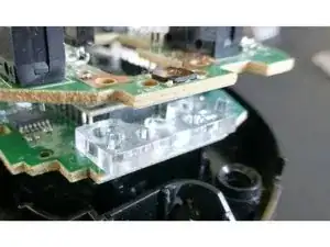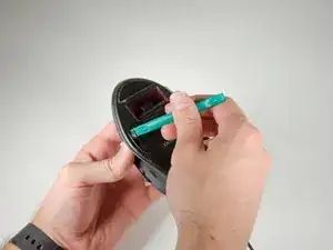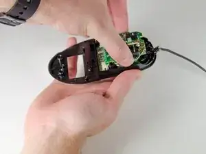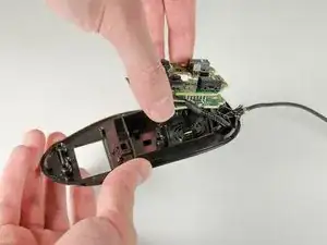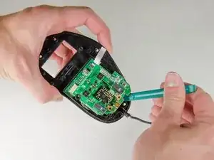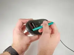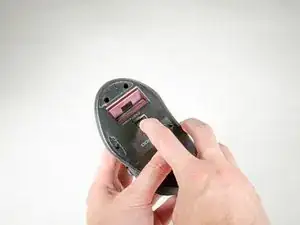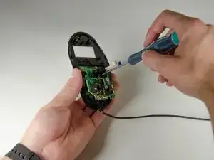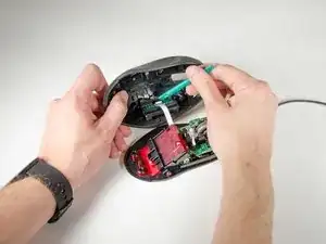 Снимите два параллельных винта, держаших чёрный пластиковый элемент на корпусе мыши.