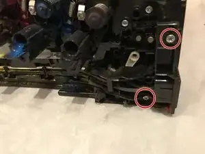 Отвинтите два филипсовских винта длиной 7 мм, удерживающих кронштейн разъёма сетевого ввода на принтере.