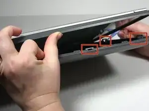 Обратите внимание, что верхний и нижний корпуса соединены серией из 6 фиксирующих элементов. По одному фиксирующему элементу на каждом из длинных боков сканера, примерно 15 см от углов. По два фиксирующих элемента на каждом из коротких боков сканера, примерно 6 см от углов. Используйте лопатку для освобождения фиксирующего элемента от верхнего корпуса.