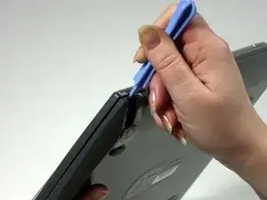 Вставьте пластиковый инструмент для открытия между верхним и нижним корпусами сканера, при этом зацепляя верх.