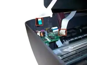 Снимите пластиковую панель управления принтером, расположенную в верхнем левом углу.