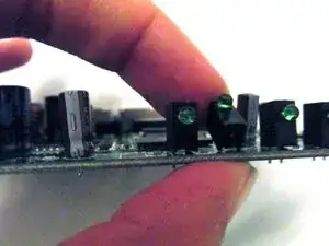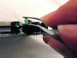 Пинцетом аккуратно расшевелите светодиод вперед-назад между контактными проводами, пока он не выйдет из посадочного места и не станет доступен для извлечения.