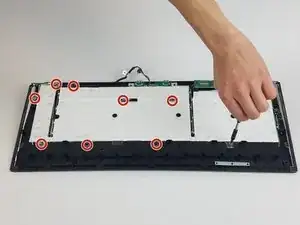 Выверните два серебристых винта Phillips #1 длиной 4,5 мм и семь винтов Phillips #1 длиной 5,0 мм, препятствующих снятию пластиковой панели.