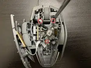 На основании мыши M65 Elite находятся два винта по бокам от нижнего винта грузика. Используйте длинную отвёртку Phillips PH00, чтобы удалить их, так как это облегчит снятие внутренней крышки.