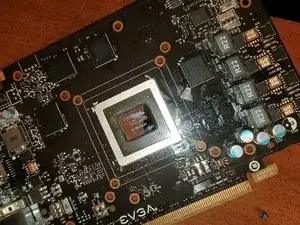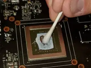 Осторожно протрите верхнюю часть графического чипа 91% изопропиловым спиртом, чтобы удалить старую термопасту; не используйте слишком сильное давление, чтобы не поцарапать чип.