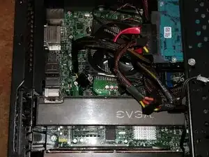 На материнской плате нажмите защёлку сбоку слота PCI Express (порта, к которому подключена видеокарта) и потяните видеокарту, чтобы извлечь её из системы.