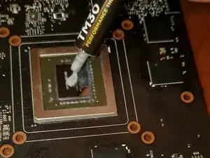 Нанесите небольшую каплю термопасты размером с горошину в центр графического чипа.