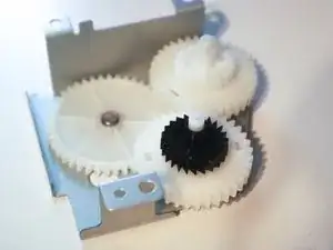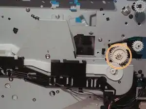 Выкрутите 3 винта, крепящих шестерни двусторонней печати к принтеру, и снимите шестерни.