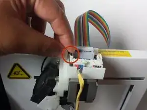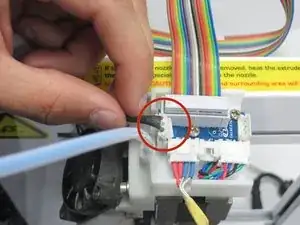Найдите разъем вентилятора, типа JST с 2 контактами, на плате экструдера в верхней части сборки экструдерa и, крепко удерживая пластиковую часть разъема, аккуратно вытащите провод.