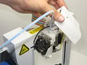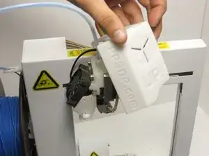 Снимите пластиковую крышку, находящуюся на экструдере рядом с вентилятором, подняв зажимы сзади. Зажимы должны легко выйти.