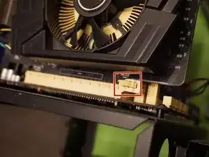 Далее отключите кабель GPU большим и указательным пальцами. Это частично отсоединит вентилятор от материнской платы.