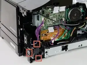 Существует три защелки вдоль правого заднего угла принтера под показанной панелью (местоположение обозначено на втором изображении).