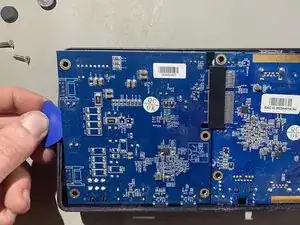 Пластиковой лопаткой осторожно сместите материнскую плату из корпуса, убедитесь, что все передние разъёмы не застряли, так как они прилегают к задней панели.