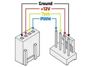 Сначала проверьте полярность проводки оригинального вентилятора. В данном случае: красный = 12В, жёлтый = масса, чёрный = тахометр