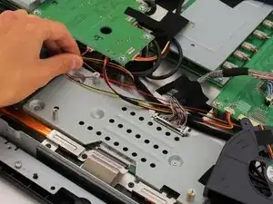 Отсоедините тонкий чёрный провод, соединяющий заднюю металлическую пластину с USB-видеопортом, сняв один винт Phillips #2 длиной 8 мм с задней металлической пластины, поворачивая отвёртку против часовой стрелки.