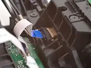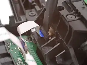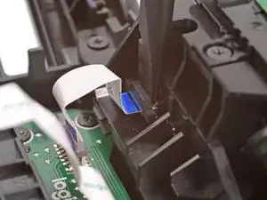 При повторной сборке вставьте кабель в разъём так, чтобы его синяя метка была наружу, затем опустите подвижную защёлку, чтобы зафиксировать кабель.