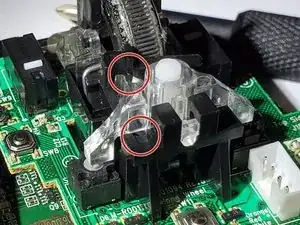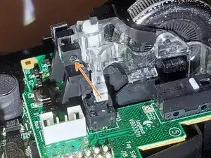 Удалите чёрный штифт, который фиксирует колесо прокрутки на материнской плате.