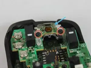 Прозрачная передняя часть имеет отверстие, которое насаживается на прозрачный выступ чуть ниже скобы (синяя стрелка на втором изображении) — это позволяет колесу прокрутки поворачиваться влево и вправо для функций прокрутки влево и вправо.