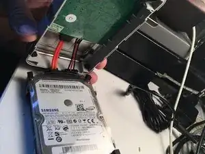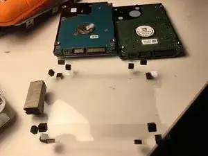 выньте диск, он по-прежнему подключён к SATA-разъёму и завернут в жёсткую прозрачную пластиковую оболочку, удерживающую маленькие чёрные резиновые упоры