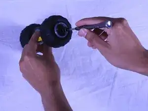 Используя отвёртку, выкрутите переднее колесо, поворачивая винт, расположенный в центре колеса, против часовой стрелки.