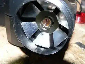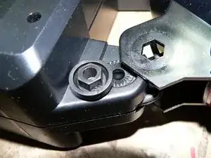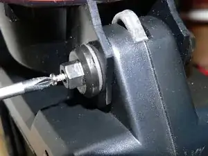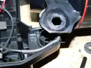 Для разборки используйте длинную крестовую отвёртку, которая правильно сидит в головках винтов. Удалите длинный винт, скрепляющий шарнир лампы, выньте пластиковый штифт шарнира и снимите лампу — для этого потребуется значительное усилие пальцев. Храните снятые детали в надёжном месте. Обратите внимание на резиновые шайбы между фланцем штифта и кронштейнами.
