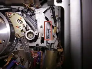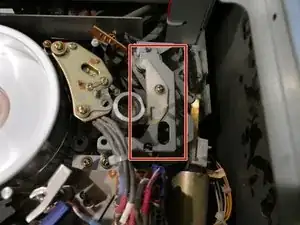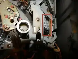 На этом изображении зажимное устройство скрыто под этой опорой. Вот как оно выглядит в заблокированном положении. В этом положении оно должно находиться во время воспроизведения кассеты.
